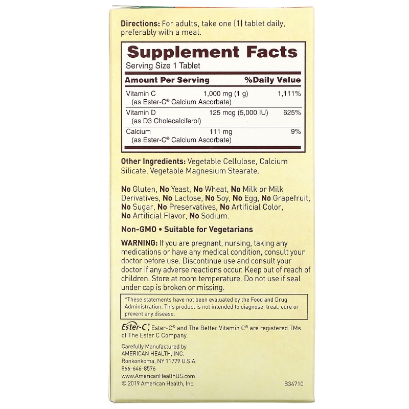 Компоненты добавки American Health, Эстер-C с D3, оздоровительный комплекс для костей и иммунитета, 1000 мг/5000 МЕ, 60 вегетарианских таблеток