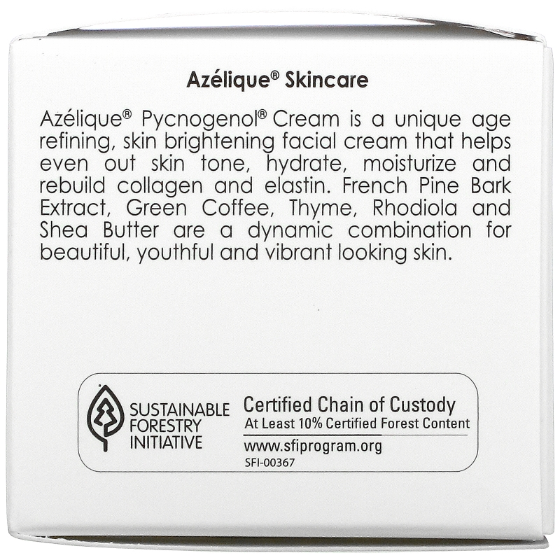 Azélique Pycnogenol® Cream is a unique age refining, skin brightening facial cream that helpseven out skin tone, hydrate, moisturize and rebuild collagen and elastin. French Pine Bark Extract, Green Coffee, Thyme, Rhodiola and Shea Butter are a dynamic combination for beautiful, youthful and vibrant looking skin.