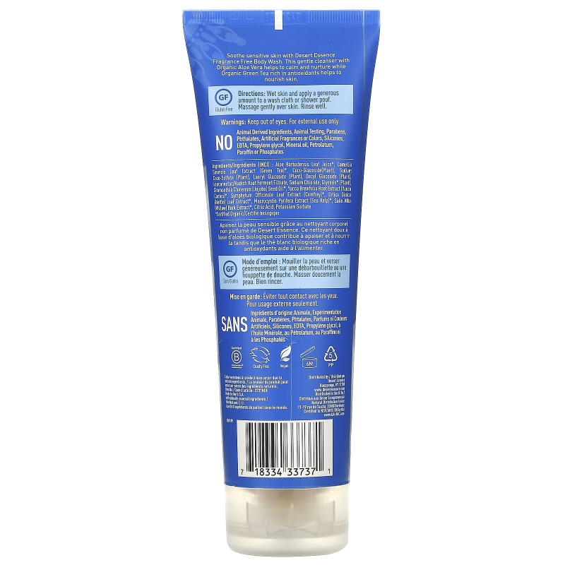 Soothe sensitive skin with Desert Essence Organics Fragrance Free Body Wash. This luxurious cleanser contains organic aloe vera to calm and soothe, as well as organic green tea, rich in antioxidants, to protect skin.