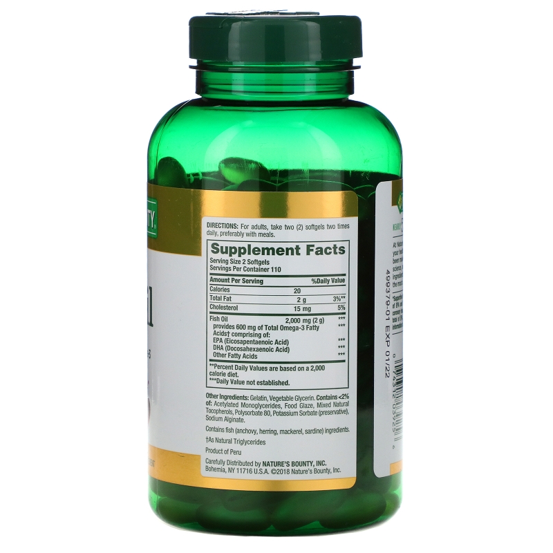 Рыбий жир без запаха содержит ЭПК и ДГК, поддерживающие здоровье сердечно-сосудистой системы. Омега-3 жирные кислоты считаются полезными жирами и поддерживают ранее находившийся в норме уровень триглицеридов. Этот рыбий жир от Nature's Bounty покрыт оболочкой для уменьшения привкуса и рыбной отрыжки! Он очищен от тяжелых металлов и других загрязнителей, таких как ртуть, полихлорированные дифенилы и диоксины.