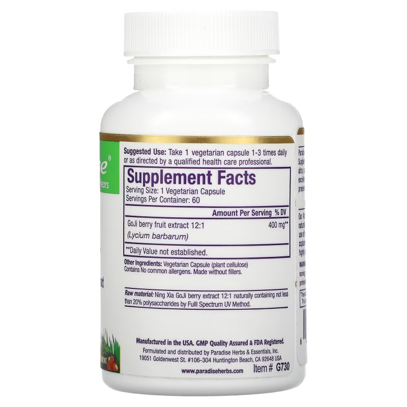 Описание добавки Paradise Herbs, Го джи, 100% чистоты, 60 растительных капсул