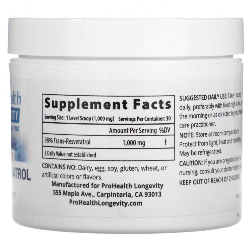 Микронизированный порошок транс-ресвератрола от ProHealth содержит 1000 мг натурального транс-ресвератрола фармацевтической степени чистоты 99,5% на порцию. Частицы микронизированы для лучшего впитывания.