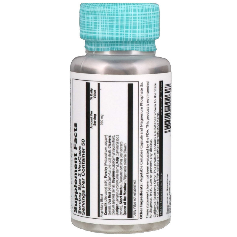 | Proprietary Blend Cornsilk (Zea mays) (silk), Parsley (Petroselinum crispum) (aerial), Uva Ursi (Arctostaphylus uva-ursi) (leaf), Cleavers (Galium aperine) (aerial), Cayenne (Capsicum annuum) (fruit), Juniper (Juniperus communis) (berry), Kelp (Laminaria spp.) (whole), Short Buchu (Barosma betulina) (leaf extract), Queen of the Meadow (Filipendula ulmaria) (flower) | 940 mg | * |