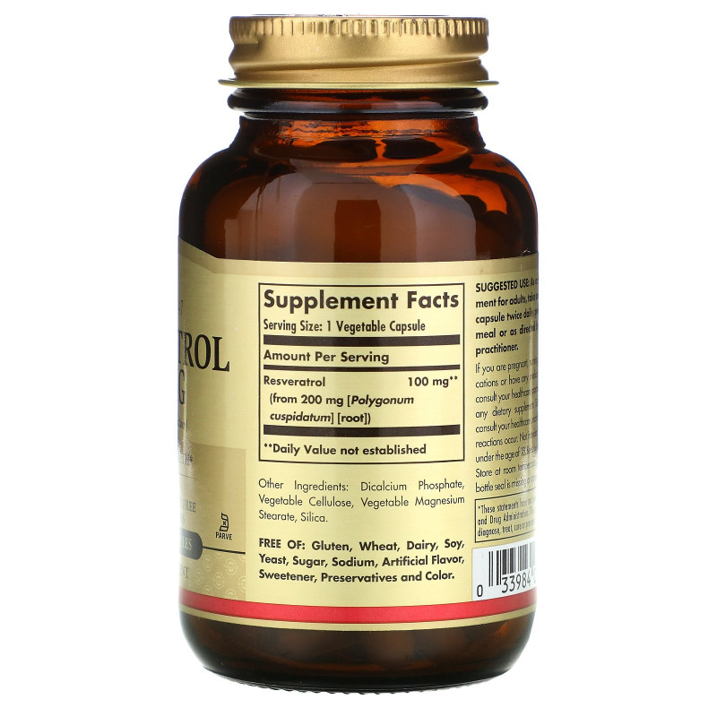 Solgar's Resveratrol 100 mg vegetable capsules are free of yeast, wheat, soy, gluten and dairy products and are formulated without the use of artificial preservatives, flavors, or colors.