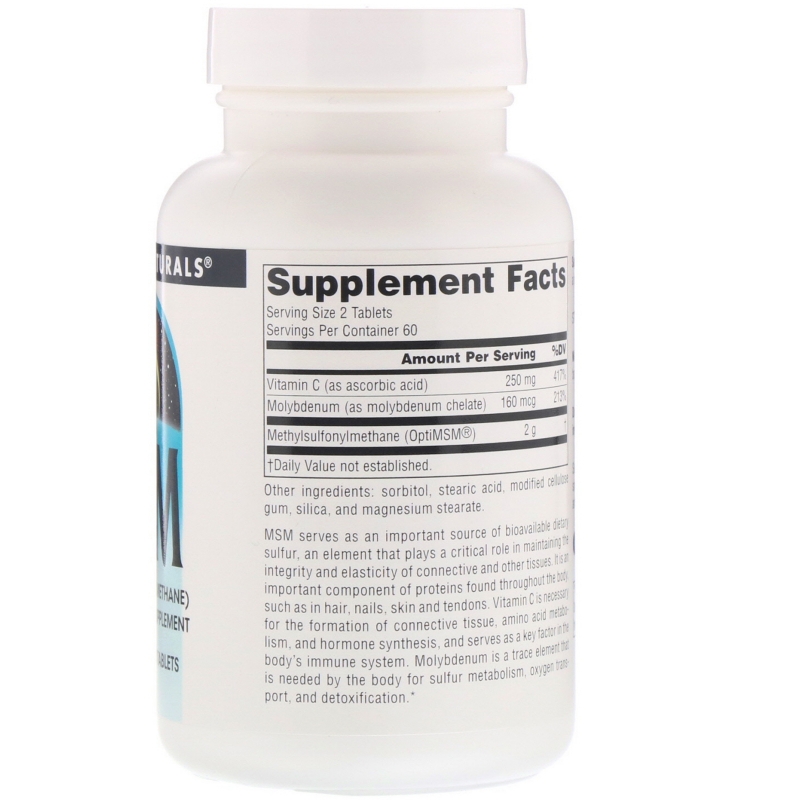 MSM служит важным источником биологически диетической серы, элемента, который играет важнейшую роль в сохранении целостности и эластичности соединительной и других тканей. Это важный компонент белков, обнаруженных во всем теле, например, в волосах, ногтях, коже и сухожилиях. Витамин С необходим для формирования соединительной ткани, обмена аминокислот и синтеза гормонов и служит в качестве ключевого фактора в иммунной системе организма. Молибден это микроэлемент, который необходим организму для метаболизма серы, транспорта кислорода и детоксикации.