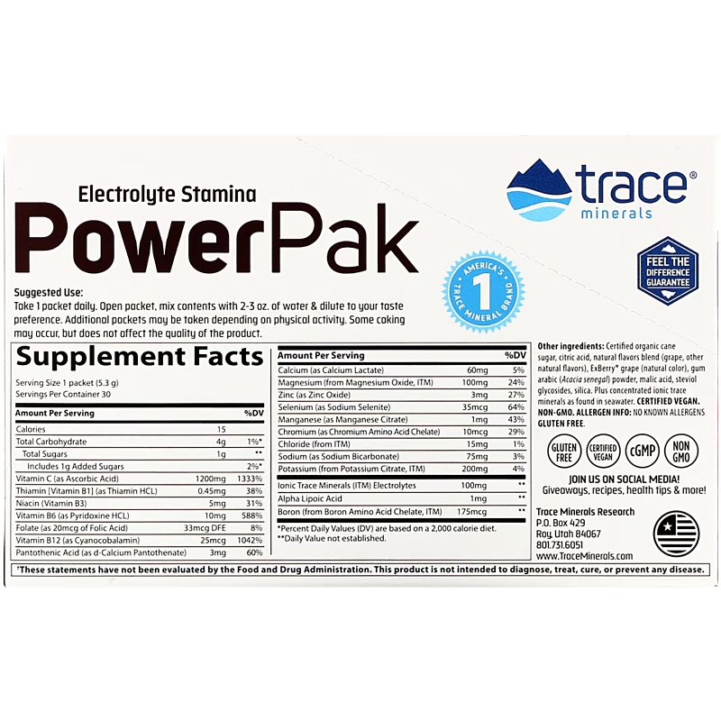 Если вы когда-либо чувствовали себя опустошенными или вялыми после жаркого дня на солнце или тяжелой тренировки, вы можете почувствовать что вашему телу нужно больше электролитов. Electrolite Stamina Power Pak - это простой в использовании высокоэффективный энергетический напиток без кофеина или искусственных стимуляторов. Наша формула содержит 1200 мг витамина С, необходимого антиоксиданта для людей, которые активны и находятся постоянно в движении. Он также содержит все основные электролиты (калий, магний, хлорид и натрий), а также более 72 проверенных ионных микроэлементов от ConcenTrace, что ускоряет ассимиляцию и поглощение витаминов и питательных веществ. Эти электролиты проводят электрические импульсы в организме, а также помогают поддерживать баланс кислоты в организме для большей энергии и жизнеспособности. Дефицит любого из этих электролитов или даже дисбаланс могут вызывать широкий спектр проблем, включая медлительность, случайную усталость, снижение энергии и мышечные судороги. Таким образом, играйте тяжелее, будьте более выносливыми и употребляйте Electrolyte Stamina Power Pak, правильный способ оживить и зарядить источник энергии вашего тела. ConcenTrace является торговым названием для концентрированных морских минералов из Солт-Лейк Сити.