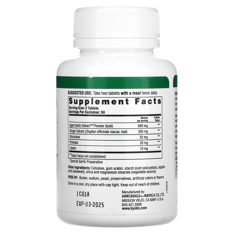 Смесь растительных ингредиентов и энзимов Kyolic Формула 102 содержит уникальную натуральную комбинацию выдержанного экстракта чеснока, имбиря, глюканазы, липазы и протеазы, совместное действие которых направлено на поддержку внутреннего очищения организма, нормализацию функции кишечника и пищеварительной системы.