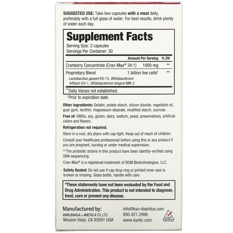 Описание добавки Kyolic, Kyo-Dophilus, пробиотики, с экстрактом клюквы, 60 капсул