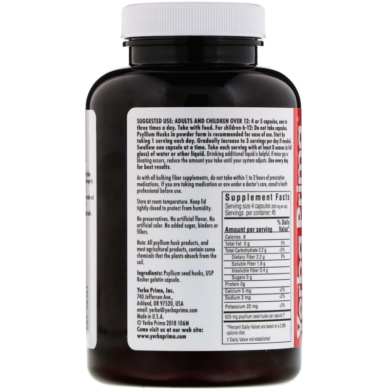 Yerba Prima, Капсулы с шелухой семян подорожника, 625 мг, 180 капсул